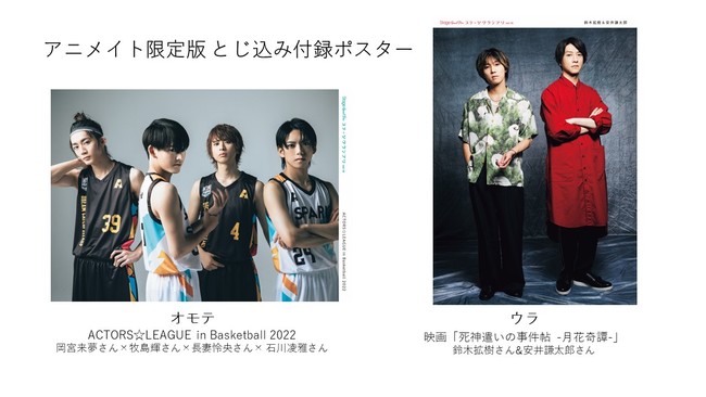 また本誌とじ込み付録には『ACTORS☆LEAGUE in Basketball 2022』岡宮来夢、牧島輝、長妻怜央、石川凌雅、映画「死神遣いの事件帖 -月花奇譚-」鈴木拡樹&安井謙太郎のA3両面ポスターが付いてくる。
