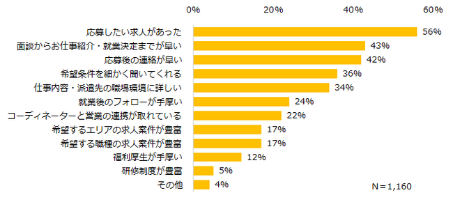 これまで派遣で働いたことがある方に、就業を決めた派遣会社の特徴を伺うと、トップ3は「応募したい求人があった」(56%)、「面談からお仕事紹介・就業決定までが早い」(43%)、「応募後の連絡が早い」(42%)でした。派遣会社の対応で良いと思ったエピソードも紹介します。
