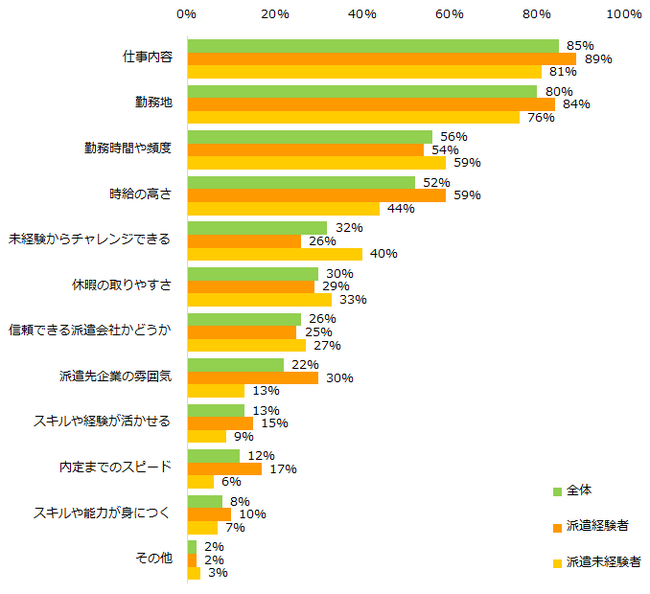 2:派遣での就業を決める上で重視すること、派遣経験者・未経験者ともに8割以上が「仕事内容」と回答。(図2)