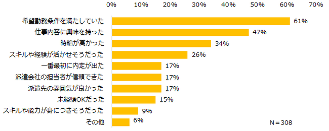 現在の仕事に就業を決めた理由、トップ3は「希望勤務条件を満たしていた」「仕事内容に興味を持った」「時給が高かった」。