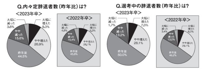 2023年卒採用の本当の課題は「内定を出した後」に。内々定辞退者数が昨年よりも増えたと回答した企業<36.2%>。5.3%はいったん採用活動を終了したが再開させ、夏・秋採用を計画。