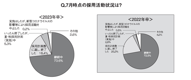採用活動を「継続中」と回答した企業は、73.6%に上り、昨年同時期比1.1ポイント増加しました。また、5.3%の企業が「いったん終了したが、夏・秋採用計画(実施)中」と回答。昨年同時期を2.5ポイント上回っており、企業の採用意欲は高い状態であることが分かります。