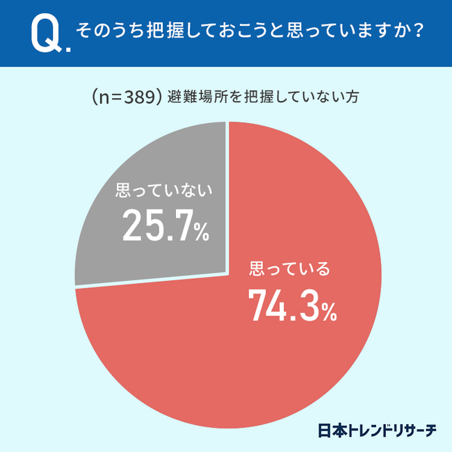 34.4%の方が災害時に自分が避難する場所を「把握していない」と回答していますが、その中の74.3%の方が「そのうち把握しておこうと思っている」と答えています。
