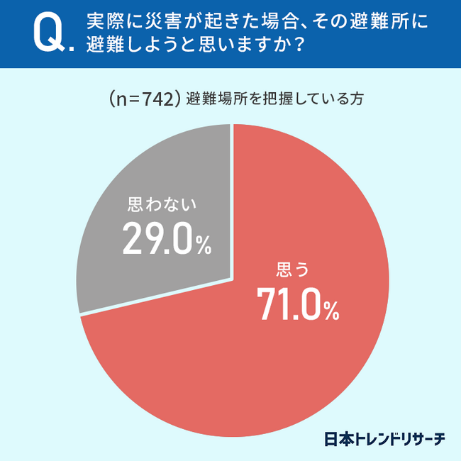 29%の方が実際に災害が起きた場合、その避難所に避難しようと「思わない」と回答しています。
