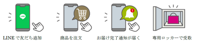 専用ECモールから、受取駅(ロッカー)・受取日・商品を選びクレジットカードで決済をすると、注文が完了します。注文後、お届けが完了するとLINEでお届け完了通知が届きますので、通知内のロッカー解錠用二次元コードを準備の上、専用ロッカーで商品をお受け取りいただきます。