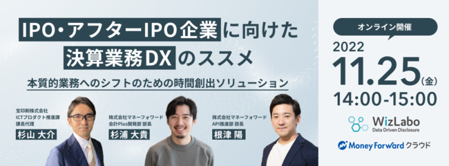 『IPO・アフターIPO企業に向けた決算業務DXのススメ』を2022年11月25日(金)14:00からオンラインで実施します。本セミナーでは、『WizLabo』と『マネーフォワード クラウド会計Plus』のAPI連携の背景から、実際の連携ソリューションまで、両社の企画・開発部門の担当者より、ご説明します。