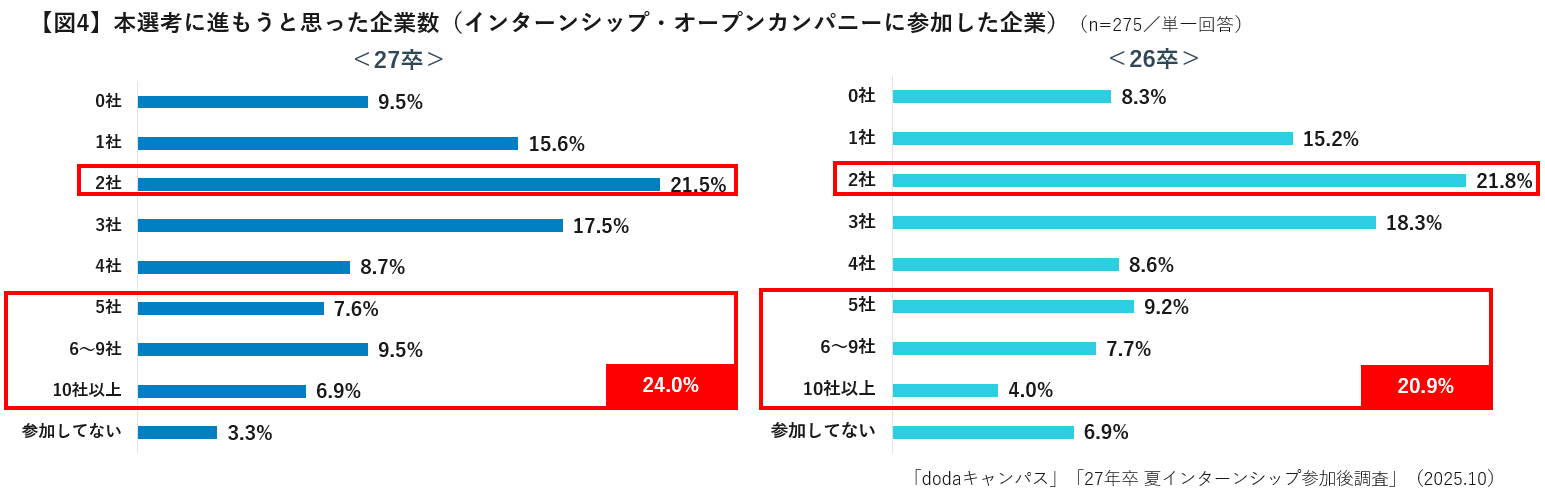 ・インターンシップ、オープンカンパニーに参加した企業の選考に進もうと思った企業数は「2社」(21.5%)が最多。「5社」以上の回答合計が全体の24%、26卒の20.9%から3.1ポイント上昇。