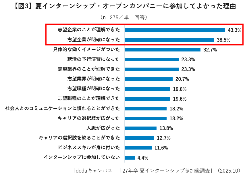 ・インターンシップ、オープンカンパニーに参加してよかった理由の1位は「志望企業のことが理解できた」(43.3%)