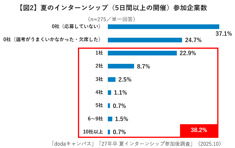 「dodaキャンパス」に登録している27卒学生を対象に、今夏のインターンシップ・オープンカンパニーの参加状況について聞いたところ、参加企業数が「1社以上」と回答した割合は、1dayのしごと体験などを含めたオープンカンパニーでは89.1%、インターンシップでは38.2%でした。