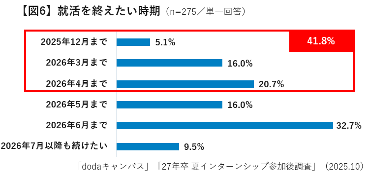 就活を終えたい時期については、「25年12月まで」から「26年4月まで(大学4年4月)」の回答合計が41.8%となりました。