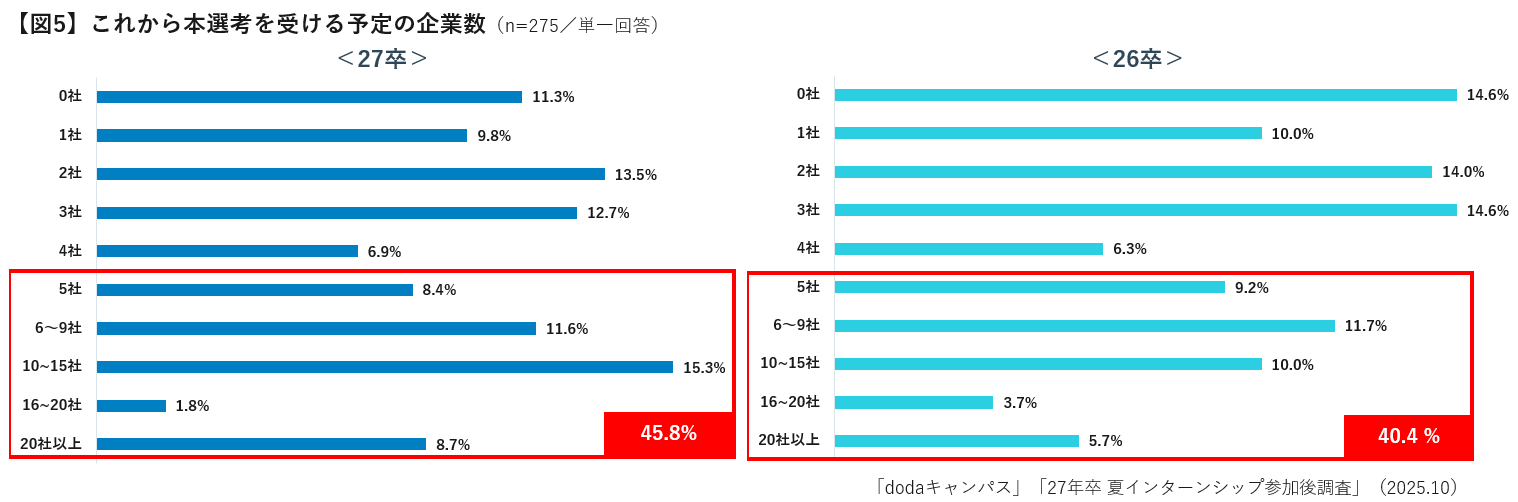 これから本選考を受ける予定の企業数は、「5社以上」の回答合計が45.8%となり、26卒比で4.4ポイント上昇しました。