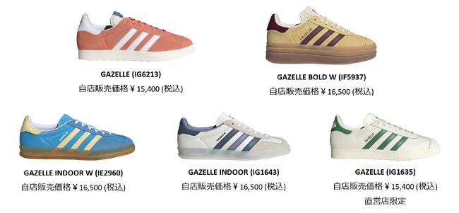 80年代のカナダ製モデルからインスピレーションを得たGAZELLEや、シグネチャーであるスエードアッパーを大胆にもレザーアッパーで刷新したモデルなど、クラシックスタイルを継承しつつもフレッシュな装いのバリエーションが揃います。また、ユニークなカラーリングを配した、クリアガムソールが特徴のGAZELLE INDOOR、クラシックなアッパーに3層構造の厚底ソールを兼ね備えたGAZELLE BOLD Wなどバリエーション豊かなラインナップで展開します。