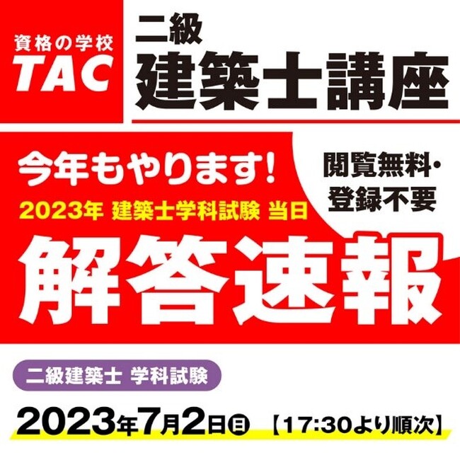資格取得に向けた教育サービスを展開しているTAC株式会社(東京都千代田区、代表取締役社長: 多田 敏男)は、7/2(日)に実施される二級建築士試験の解答速報を試験当日の17:30頃よりホームページで公開いたします。