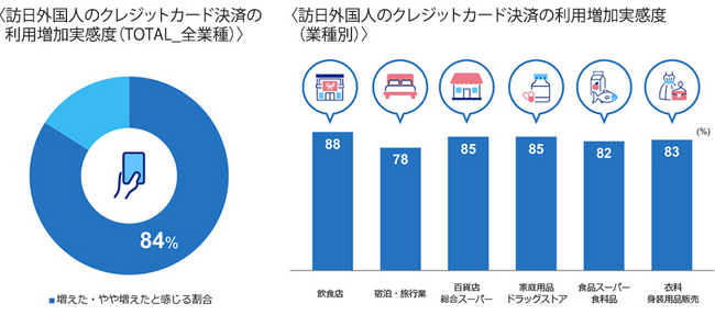 訪日外国人の増加によって、84%の店舗においてクレジットカード決済の利用が増えたと回答。