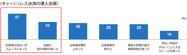キャッシュレス決済の導入効果は、「お客様の支払いがスムーズになった」が47%、「店舗の会計負担が減った」が32%と「会計時の効率」の回答が最多。