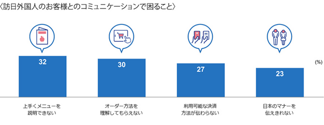 困っていることは、「上手くメニューを説明できない」が32%、次いで「オーダー方法を理解してもらえない」、「利用可能な決済方法が伝わらない」と続く。