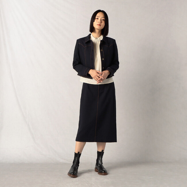 上質なツイードで、今までにないジャケットとスカートを作りたいという想いから、ブラックネイビーのツイードに金茶色のステッチを打ち、上質なデニムスタイルのツイードに仕上げました。