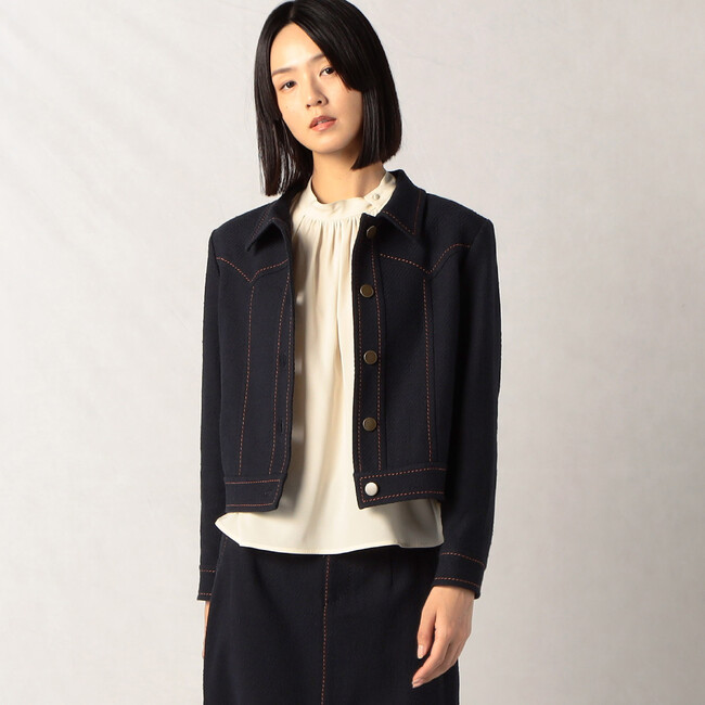 ・ネイビーのツイードにデニムジャケットを思わせる金茶色ステッチを打つことで、上品なデニムスタイルツイードに仕上げました。