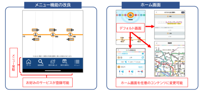 これまでは経路検索など一部のサービスを除き、「東京メトロmy!アプリ」起動後に表示される画面左上の「メニューボタン」からのみ各サービスの選択が可能でしたが、本バージョンアップ後は、「東京メトロmy!アプリ」を利用中のお客様が必要なサービスに素早くアクセスできるようになります。