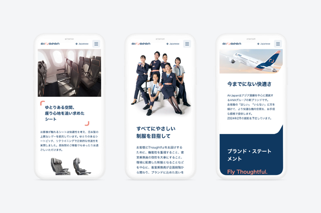 同時に、もう1つのブランドカラー「曙色」を視覚的ハイライトとして用いたり、ロゴモチーフである「手と手が織りなすカーブ」を随所に取り入れるほか、ビジュアルや写真素材のディレクションにも携わるなど、サイト上でAirJapanブランドを余すことなく実現できるようデザインしました。