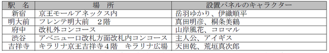 京王線:新宿駅(京王百貨店口改札付近)、明大前駅(中央口改札付近)、府中駅(改札階コンコース付近)