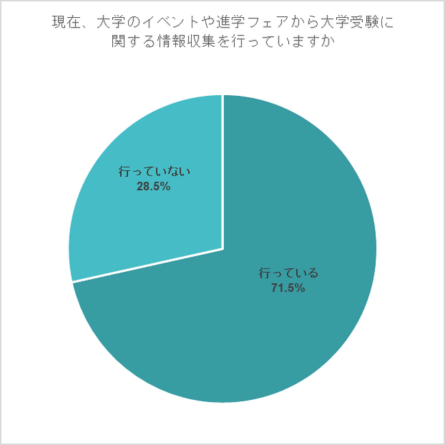 次に、【大学の説明会や文化祭などのイベントや、複数の学校が集まる進学フェアからの情報収集】に関して、高校生保護者の71.5%が大学のイベントや進学フェアから情報収集を「行っている」と回答した。「行っている」と回答した割合は、高校2年生保護者では7割以上、高校3年生保護者では8割以上にのぼった。