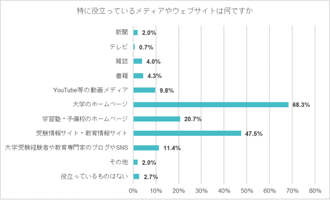 大学受験の情報収集に役立てている手段は、「大学のホームページ」「塾からの情報」「高校からの情報」