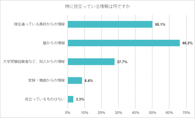 次に、【通っている高校や塾、知人からの情報収集】に関して、高校生保護者の68.7%が高校や塾、知人から情報収集を「行っている」と回答した。「行っている」と回答した保護者の割合は、メディアやウェブサイトからの情報収集と同様に、学年が上がるにつれ割合が増加する傾向が見られた。特に役立っている情報は、「塾からの情報」が66.2%、「現在通っている高校からの情報」が50.1%だった。