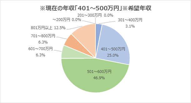 現在の年収が「201〜300万円」の20代の希望年収は、「301〜400万円」が59.4%で最多。現在の年収が「301〜400万円」の20代の希望年収は、「401〜500万円」が35.7%で最多、次いで「301〜400万円」31.6%が続きます。現在の年収が「401〜500万円」の20代の希望年収は、「501〜600万円」が46.9%で最多となりました。転職において、200万円・300万円の規模で年収を上げることを希望する20代は少なく、数10万円〜最大100万円の年収アップを希望する人が多いことが分かります。「仕事内容と給与のバランスが取れていることが大切」「現在の年収との差が大きいと、期待に応えられないのではないかと不安に思う」といった声が寄せられました。