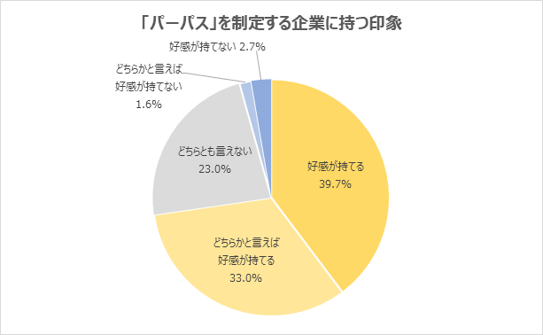 「パーパス」を制定する企業は「好感が持てる」と回答した学生が39.7%に上りました。「どちらかと言えば好感が持てる」33.0%を合わせると、72.7%の学生が「好感が持てる」としています。20代転職希望者を対象に実施した同アンケートと比較すると、「好感が持てる」と回答した割合は9.5ポイント高くなっており関心の高さがうかがえます。