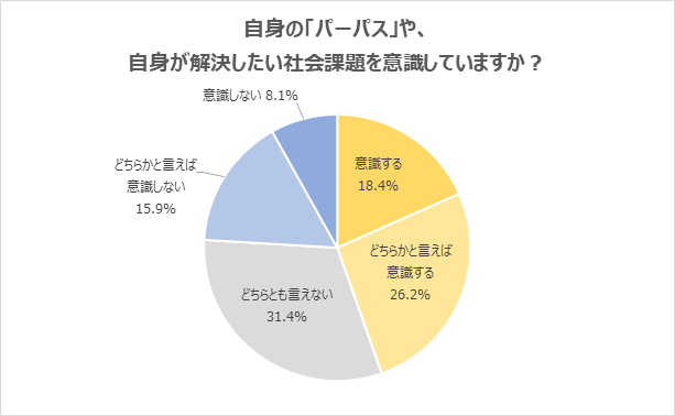自身の「パーパス」や、自身が解決したい社会課題を「意識する」と回答した学生が18.4%に上りました。「どちらかと言えば意識する」26.2%を合わせると、4割以上の学生が自身の「パーパス」や解決したい社会課題を意識していることが分かります。