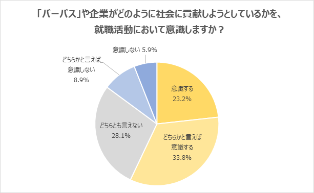 「パーパス」や企業がどのように社会に貢献しようとしているかを、就職活動において「意識する」「どちらかと言えば意識する」と回答した学生が57.0%に達しました。「パーパスを通じて、企業が目指す方向性と自身が仕事を通して提供したい価値が合致しているか確認することができる」「企業がどのように社会に貢献しようとしているかを知れば、自身が仕事を通してどのように社会に貢献できるかを想像することができる」などの声が上がっています。