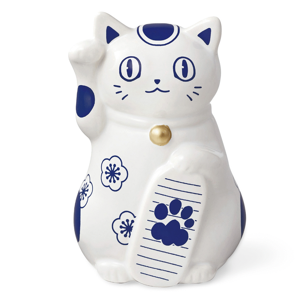 白いボディーに藍色の絵付け、胸元の鈴の金色がアクセントです。右手を上げているのは金運を招くしるし。金運がアップしちゃうかも!?