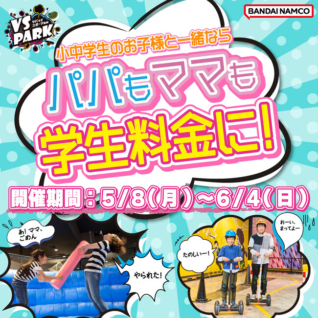 株式会社バンダイナムコアミューズメントが運営する新感覚バラエティスポーツ施設『VS PARK』では、2023年5月8日(月)から6月4日(日)までの期間、小学生または中学生のお子さまと一緒に来店すると、保護者(18歳以上・学生除く)が一般料金よりお得な学生料金で利用できる「パパもママも学生料金!」キャンペーンを開催します。また、同伴の大人も4人まで学生料金に。おじいちゃん・おばあちゃんや、ママ友を誘って、学生に戻った気分でVS PARKで思いっきりはしゃいじゃおう!