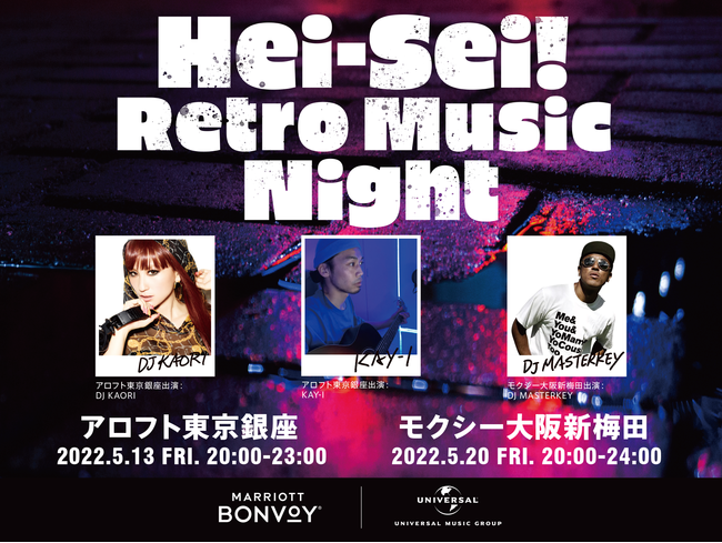 マリオット・インターナショナルは、このたび、ユニバーサル ミュージックジャパンとコラボレーションし「平成レトロ」「Y2Kミュージック」をテーマとしたイベント「Hei-Sei!Retro Music Night(平成レトロミュージックナイト)」を5月13日(金)にアロフト東京銀座、5月20日(金)にモクシー大阪新梅田にて開催いたします。