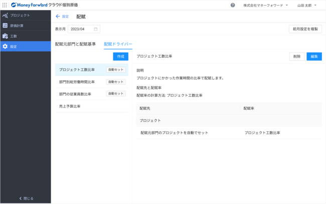 自社の運用に合わせて勘定科目ごとに配賦基準の設定が可能です。プロジェクト工数や労働時間などから自動で配賦比率を算出して間接費の配賦計算を行います。