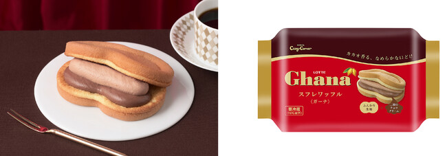 しっとり、ふんわり焼き上げたスフレのような軽い口どけのワッフル皮に「ガーナチョコレート」を使用した“チョコカスタード”と“チョコホイップ”を2層にサンド。下のチョコカスタードは、ミルク感の効いたコクのある味わいの「ガーナミルク」と、カカオの芳醇な香りとすっきりとした後味の「ガーナブラック」、カスタードをブレンド。カカオの酸味やほろにがさがミルクの優しい味わいを引き立てます。上のチョコホイップは「ガーナブラック」とホイップクリームをブレンド。深みのある、チョコレートのほどよいビター感が広がります。しっとり、ふんわり食感からあふれ出す「ガーナチョコレート」のおいしさをお楽しみください。