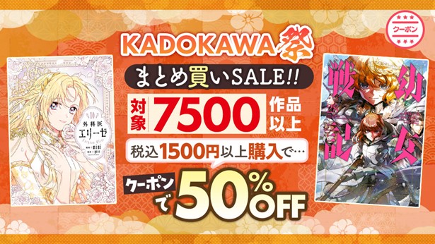 【ebookjapan】3日間限定!税込1500円以上購入で50%OFF〜『外科医エリーゼ』や『幼女戦記』など7500作品以上対象!〜