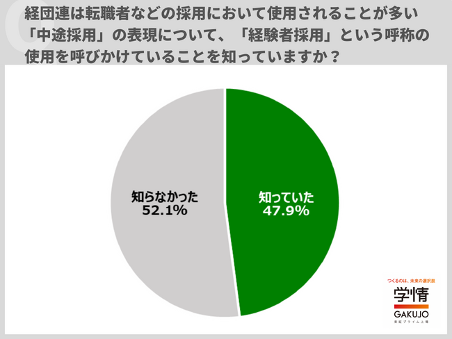 経団連は、転職者などの採用において使用されることが多い「中途採用」の表現について、「経験者採用」という呼称の使用を呼び掛けています。「経験者採用」の呼称の使用を呼び掛けていることについて、「知っている」と回答した企業は、47.9%でした。
