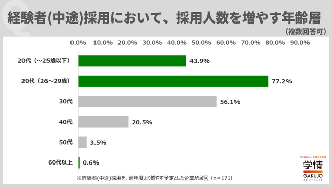 経験者(中途)採用において、採用人数を増やす年齢層は、「20代(26〜29歳)」が77.2%で最多となりました。次いで、「30代」56.1%、「20代(〜25歳)」43.9%と続きます。20代を中心に、若い世代の採用を増やしたいという意向がうかがえます。