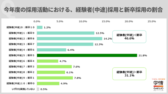 今年度の採用活動における、経験者(中途)採用と新卒採用の割合は、「5:5」が21.8%で最多となりました。5社に1社は、経験者(中途)採用と新卒採用を同割合で計画していることが分かります。「経験者(中途)採用より、新卒採用の割合が多い」と回答した企業は46.6%、「経験者(中途)採用のほうが、新卒採用より割合が多い」と回答した企業が31.1%となりました。