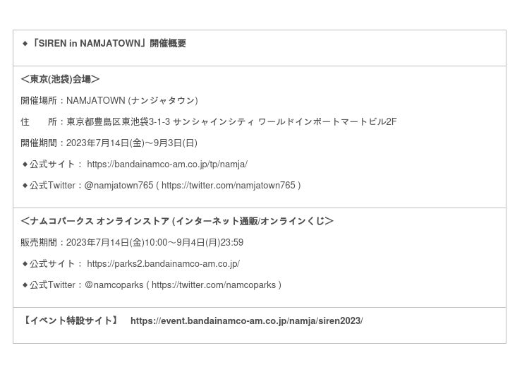 【イベント特設サイト】 https://event.bandainamco-am.co.jp/namja/siren2023/