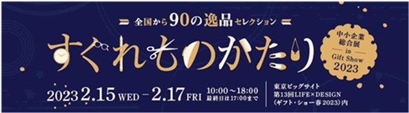 「中小企業総合展 in Gift Show 2023」では、株式会社ビジネスガイド社が主催する日本最大のパーソナルギフトと生活雑貨の国際見本市「第13回LIFE×DESIGN(ギフト・ショー春2023)」内に“すぐれものがたり”となる90社の出展ブースを設け、日本全国の中小企業が自ら企画開発・製造した、ギフト・雑貨分野の商品を一堂に展示します。展示会を通じ、国内外バイヤーとの商談機会を創出することで、中小企業の販路開拓、さらなる事業成長に繋げることを目的として開催します。