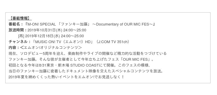 株式会社ジュピターテレコム(J:COM、本社:東京都千代田区、代表取締役社長:井村 公彦)と、音楽チャンネル「MUSIC ON! TV(エムオン!)HD」(J:COM TV 351ch)を運営する株式会社エムオン・エンタテインメント(本社:東京都港区、代表取締役:渋谷 学)は、今年8月に東京・新木場 STUDIO COASTで行われた、ファンキー加藤の初主催フェス「OUR MIC FES」の模様を「MUSIC ON! TV(エムオン!)HD」(J:COM TV 351ch)で放送することを記念して、2019年10月30日(水)に「J:COM Wonder Studio」(東京ソラマチ(R)内)にて、「ファンキー加藤×DEppa(シクラメン)スペシャルトークイベント」を開催いたしました。
