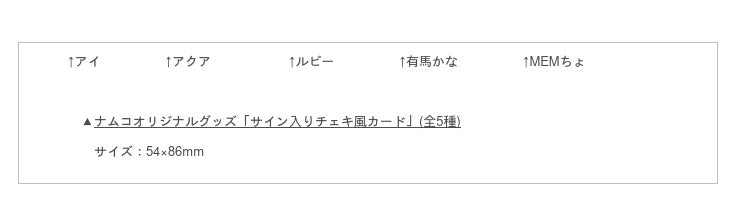 「ナムコオリジナルグッズ」は、描きおこしイラストを使用した「サイン入りチェキ風カード(全5種)」で、箔押しサインの入った欲張り仕様です。