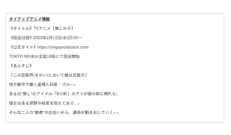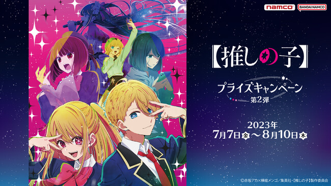 株式会社バンダイナムコアミューズメントは、TVアニメ【推しの子】とのキャンペーン第2弾として「【推しの子】プライズキャンペーン 第2弾」をアミューズメント施設「namco」にて2023年7月7日(金)〜8月10日(木)まで開催します。