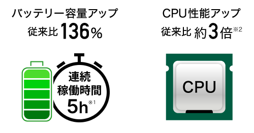 バッテリーは連続稼働時間が約5時間(※1)と、従来機の約1.3倍に。CPU等の見直しにより処理機能も大幅に向上させ、AnTuTuスコア換算で約3倍(※2)に性能強化しました。