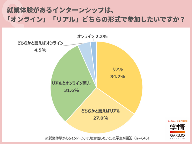 就業体験があるインターンシップの参加形式について、「リアル」と回答した学生が34.7%でした。「どちらかと言えばリアル」27.0%を合わせると、6割以上の学生がリアルでの参加を希望していることが分かります。「リアルのほうが、企業の雰囲気を体感することができると思う」「実際に経験することで、その仕事に向いているか、向いていないか分かると思う」といった声が上がっています。