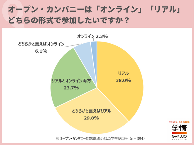 企業セミナーやグループワークなどオープン・カンパニーの参加形式について、「リアル」と回答した学生が38.0%でした。「どちらかと言えばリアル」29.8%を合わせると、7割に迫る学生がリアルでの参加を希望していることが分かります。「リアルのほうが質問しやすい」「オンラインでのグループワークは発言のタイミングをつかみにくい」「リアルのほうが人事担当者の印象にも残ると思う」「立地や社内の雰囲気など、実際に足を運んでみるからこそ得られる情報を得たい」といった声が上がっています。