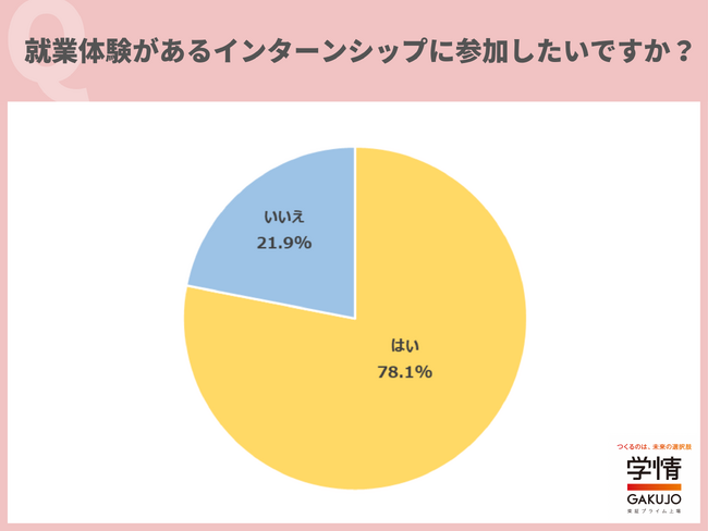 株式会社学情(本社:東京都千代田区)は、2025年3月卒業(修了)予定の大学生・大学院生を対象に、インターネットアンケートを実施。今回は、「インターンシップ/オープン・カンパニー」について調査しました。企業セミナーやグループワークなどのプログラムを実施する「オープン・カンパニー」に、「参加したい」とした学生が67.7%に上りました。「まずはセミナーやワークを通じて、業界や企業のことを知りたい」「オープン・カンパニーに参加して、興味を持った企業の就業体験に参加したい」などの声が寄せられています。また、就業体験が可能なインターンシップについては、78.1%の学生が「参加したい」としました。「参加したい」と回答した割合は、オープン・カンパニーを10.4ポイント上回っており、セミナーやワーク形式のプログラムよりも、就業体験が可能なプログラムが、学生から支持されていることがうかがえます。「インターンシップを通じて、具体的にどのような仕事をするかイメージを持ちたい」「実際に体験してみることで、仕事への適性も分かると思う」「企業の雰囲気を知りたい」などの声が寄せられました。